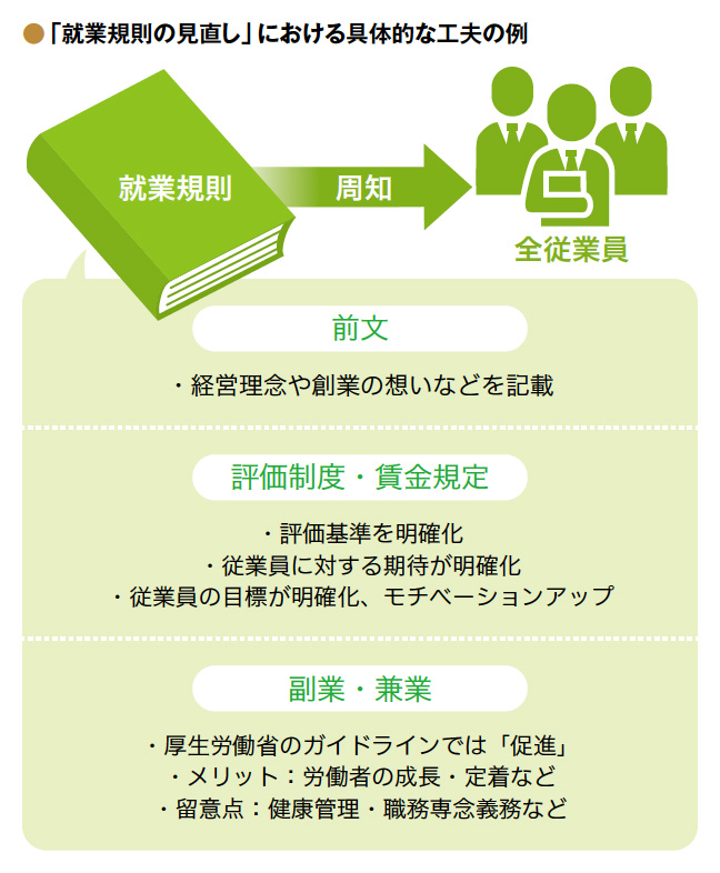それでは、ここから「就業規則の見直し」にあたり、具体的にどのような工夫ができるのかについて、考えていきたいと思います。