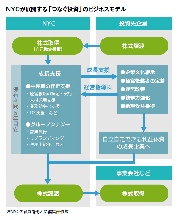画像:「つなぐ投資」による事業承継の新潮流NYCが展開する「つなぐ投資」のビジネスモデル