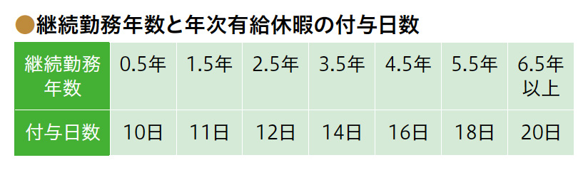 年次有給休暇は、雇い入れの日から起算して6カ月継続勤務し、会社の所定休日などを除いた全労働日の8割以上出勤することなどの権利発生の要件を満たした場合に、継続勤務年数に応じて、以下の表に定めされた日数が付与されます。