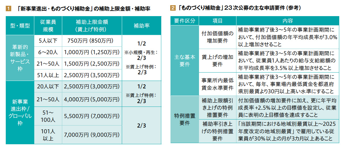 左:【図1】「新事業進出・ものづくり補助金」の補助上限金額・補助率/右:【図2】「ものづくり補助金」23次公募の主な申請要件(参考)
